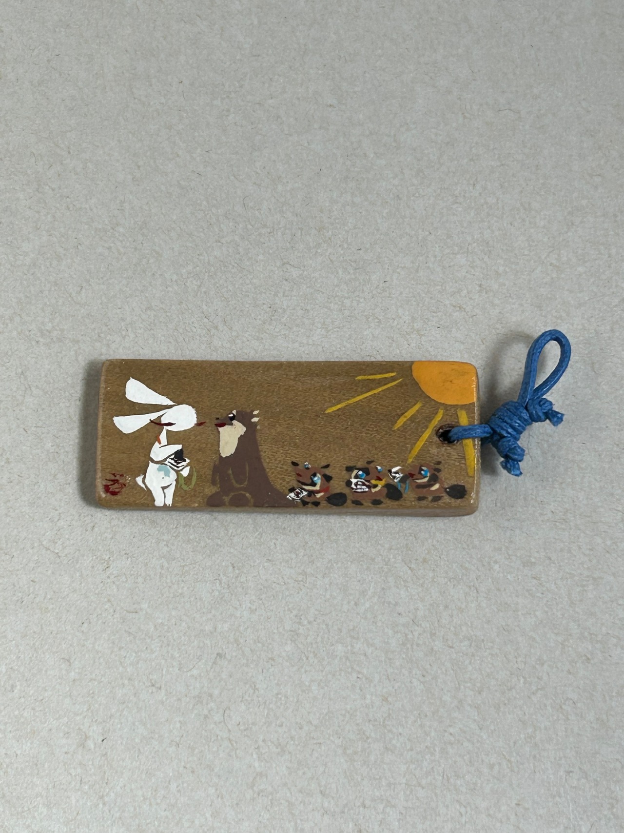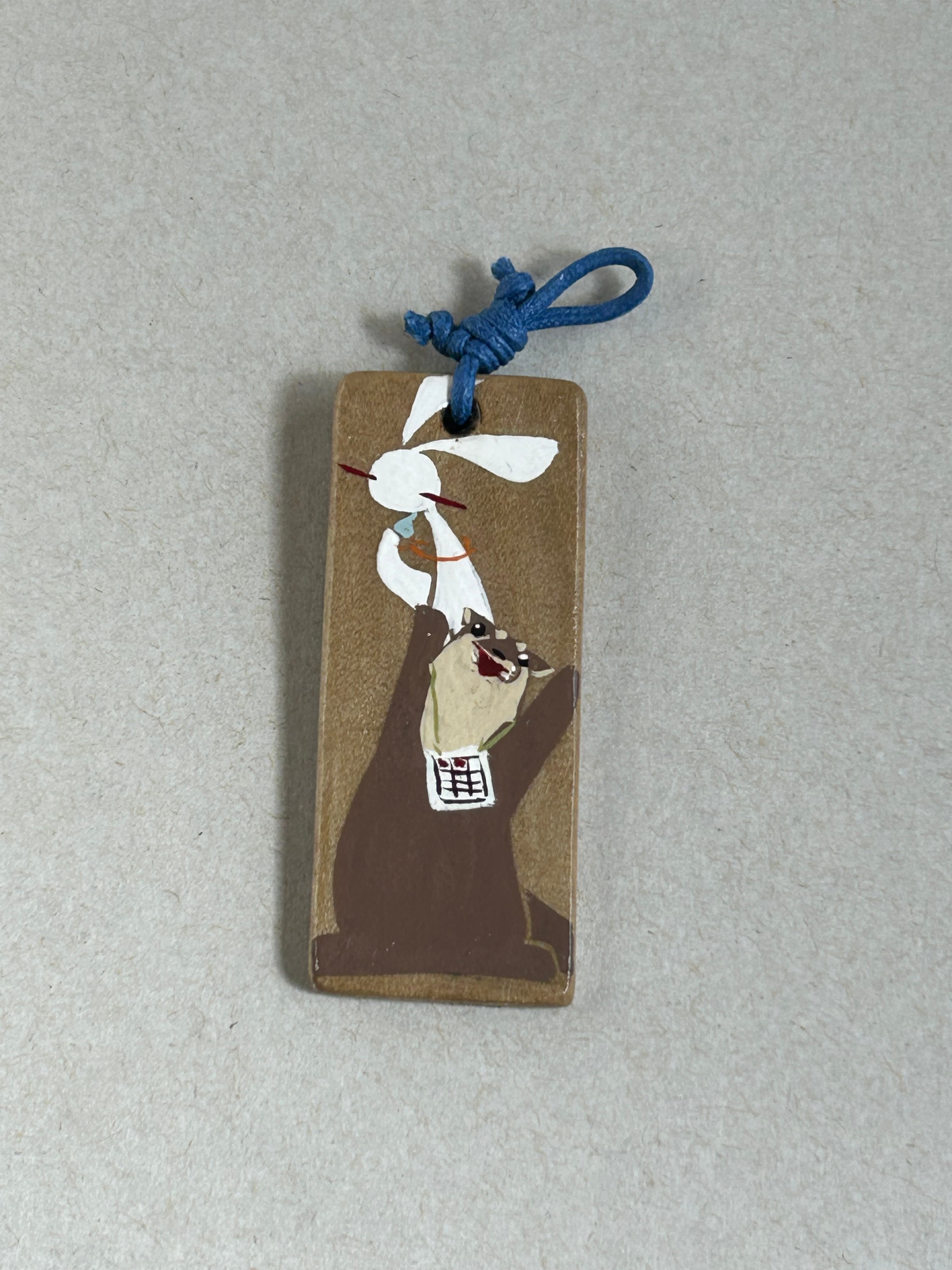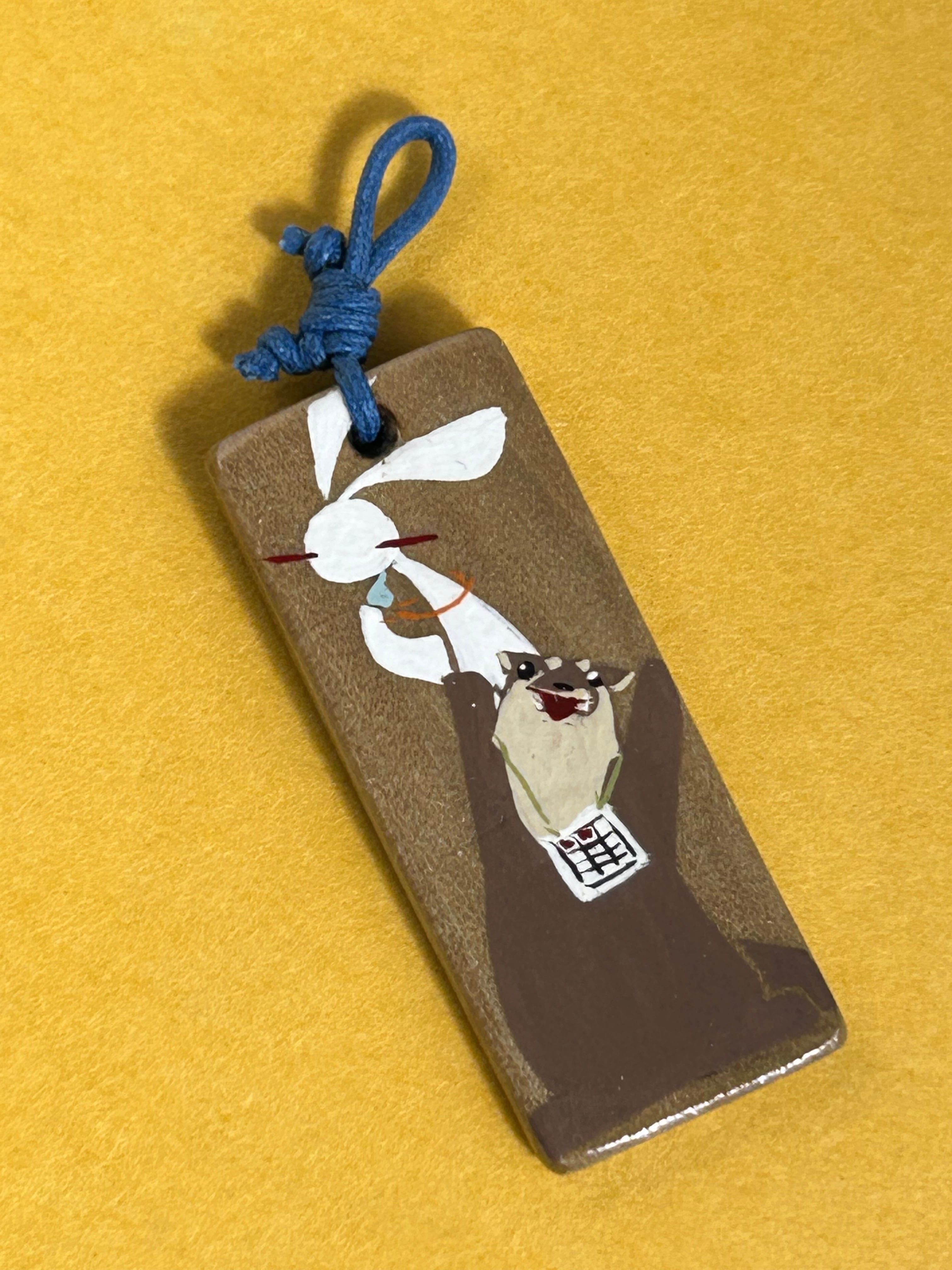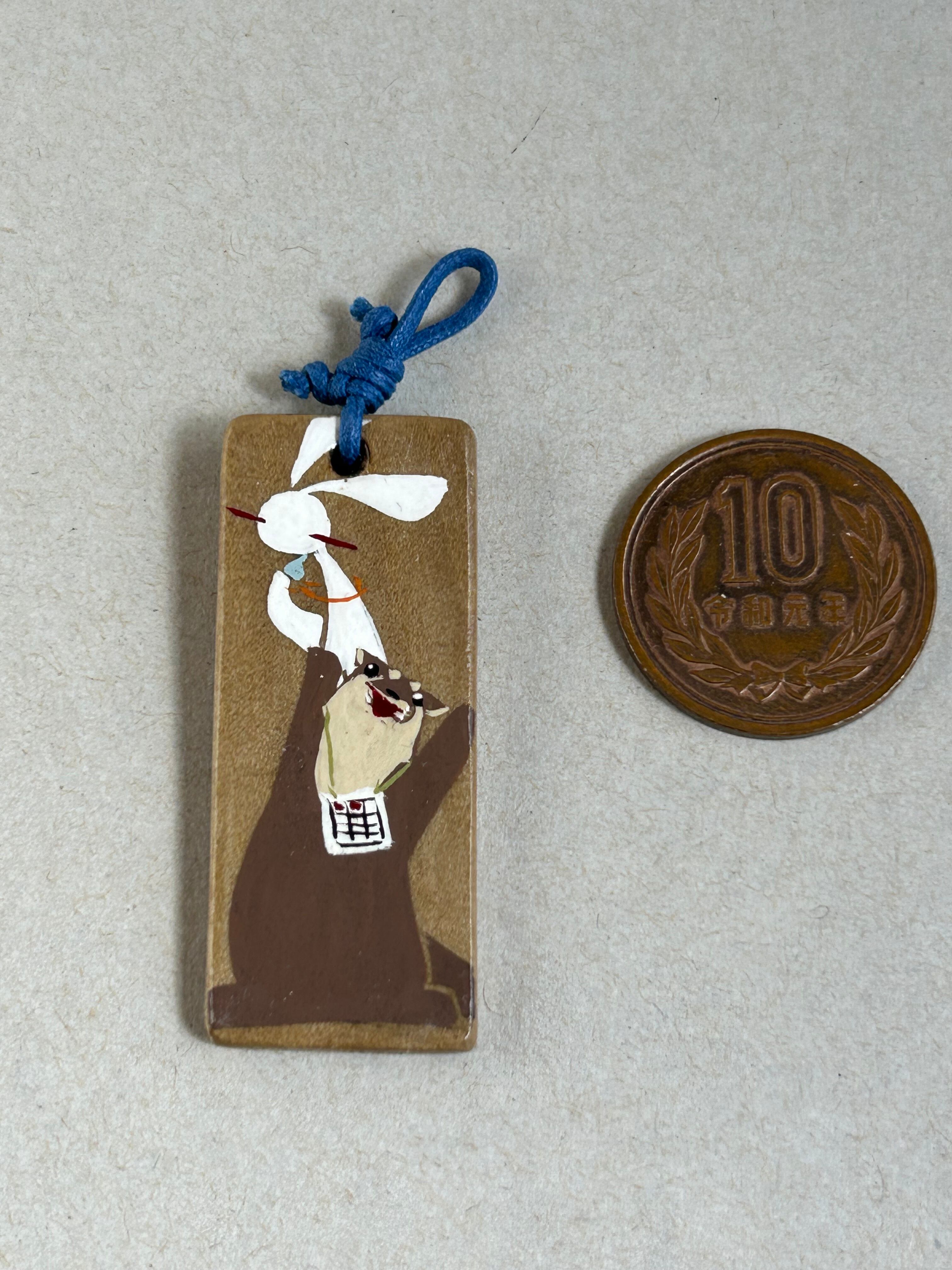 大きさはだいたい縦4.5センチ、横1.8センチ、厚さは0.3センチほどで、そこに紐がついています