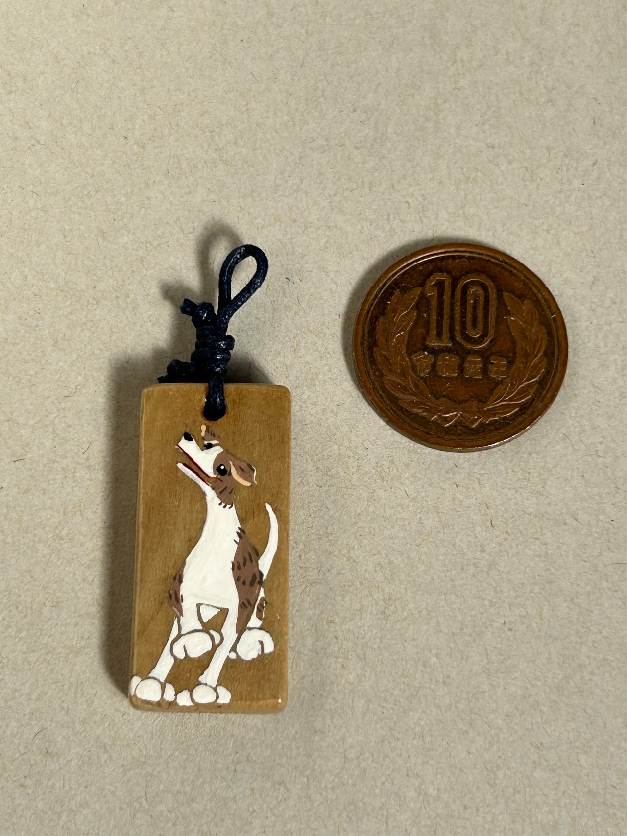 大きさはだいたい縦3.4センチ、横1.6センチ、奥行き0.5センチほどで、そこに紐がついています